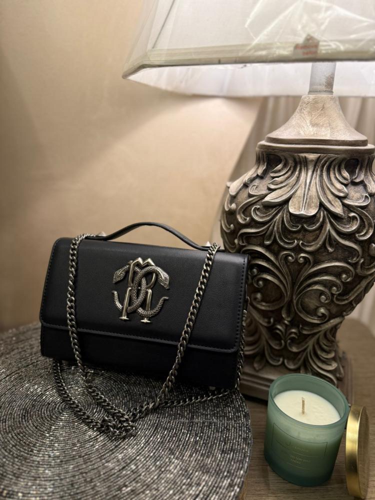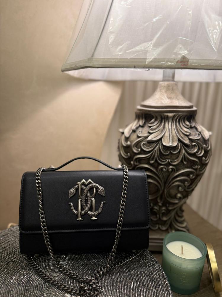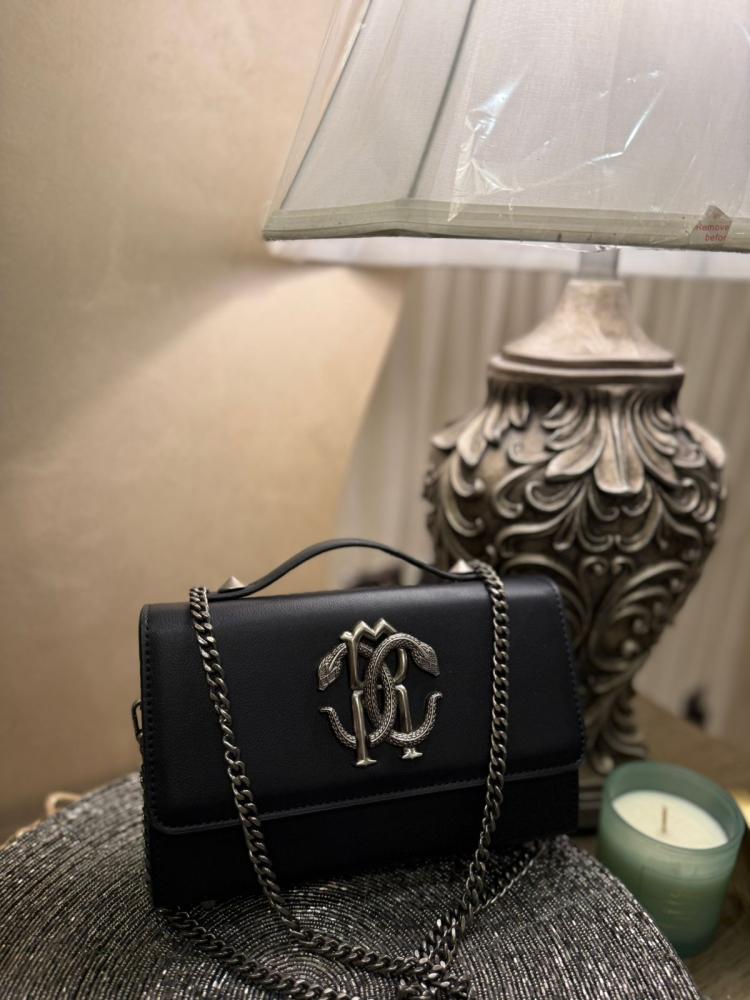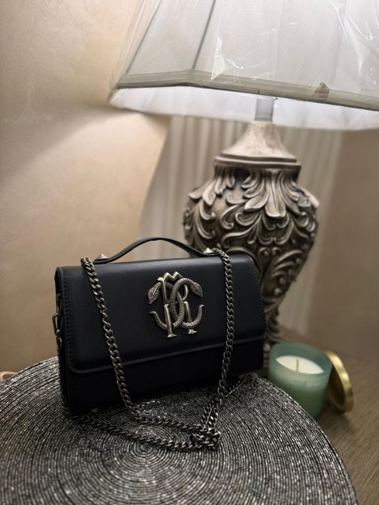 أكملي إطلالتك بالأناقة والفخامة مع حقيبة روبرتو كافالي الفاخرة التي تجمع بين الجرأة والكلاسيكية.